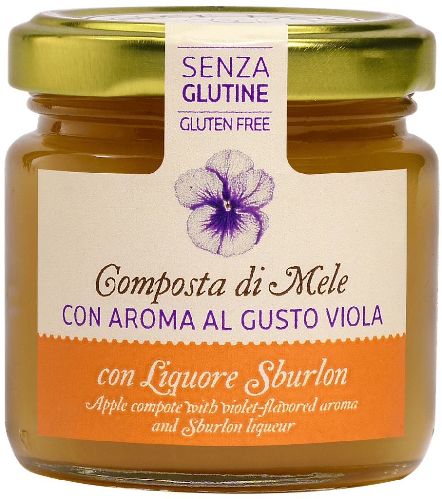 Ingredienti: mela 79%, zucchero di canna, Sburlon: liquore con infuso di mela cotogna 0,5% (acqua, alcool, zucchero, infuso idroalcolico di mele cotogne 2%, aromi), succo di limone, aroma al gusto di viola 0,1%.